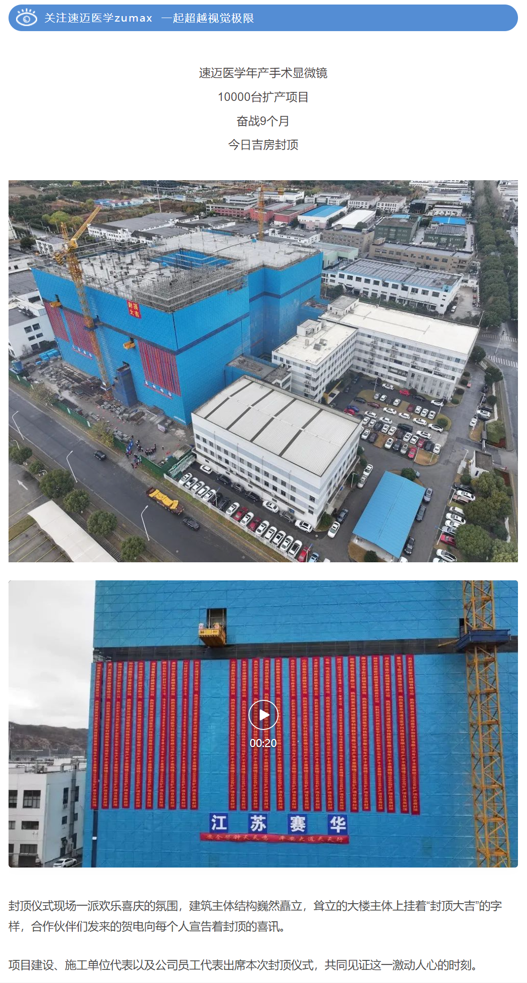 封頂大吉!速邁醫學年產手術顯微鏡10000臺擴產項目吉房封頂